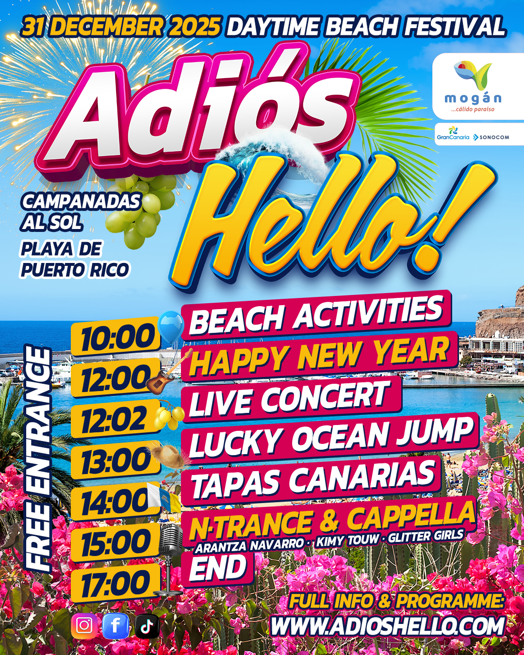 Todo el mundo está invitado a Playa de Puerto Rico, Mogán, el 31 de diciembre de 2025 de 10-17h. para despedir el año de una forma divertida, única e inolvidable. A las 12:00, celebraremos un Año Nuevo anticipado con una emocionante cuenta atrás seguida de la emblemática tradición de comer las 12 uvas de la suerte.
