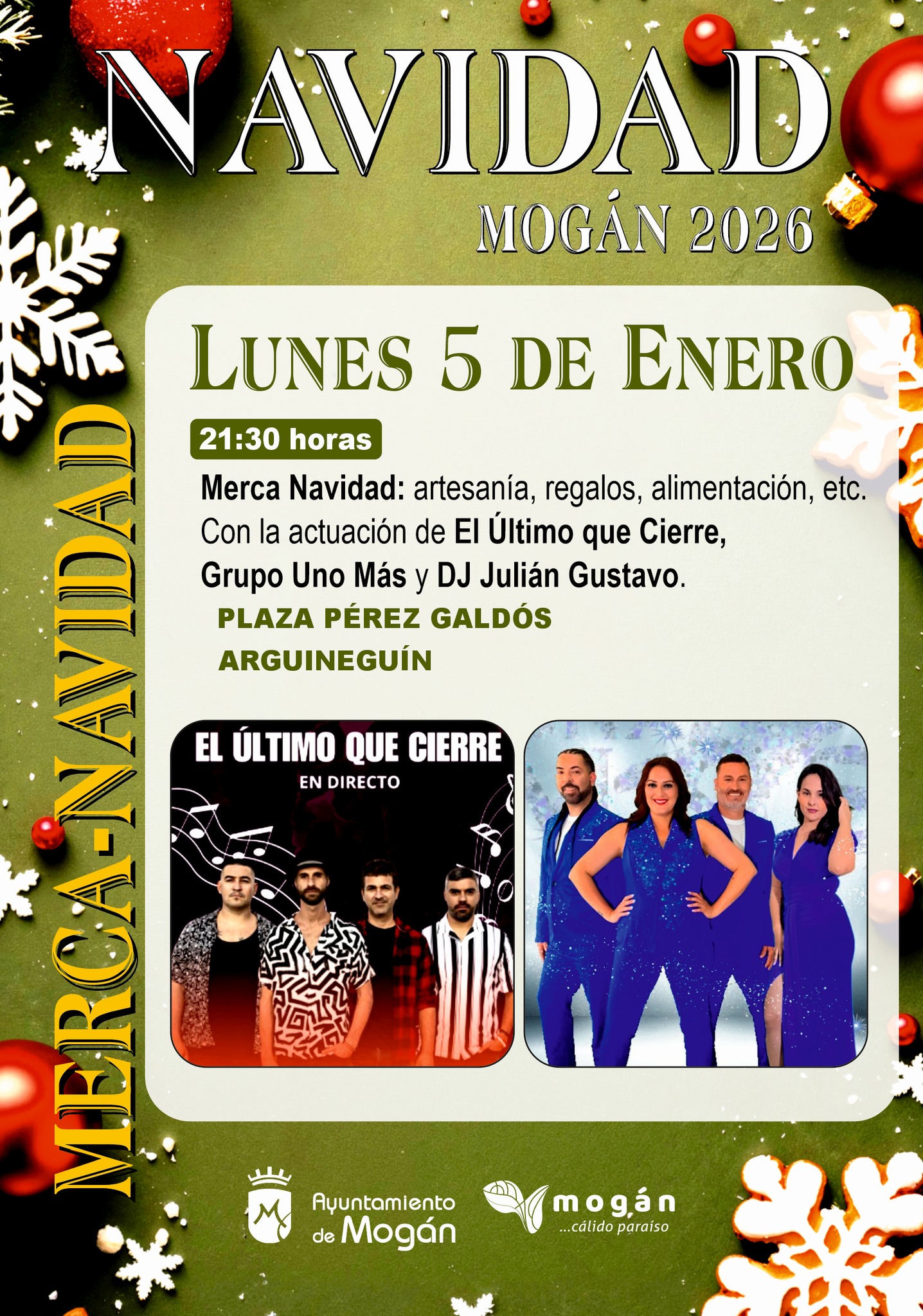 Además, esa misma noche, tras el Pasacalles de Reyes Magos, se celebrará en la misma plaza Pérez Galdós 'Merca Navidad', un mercado de artesanía, regalos y alimentación. Arrancará a las 21:30 horas y estará ambientado con las actuaciones de las bandas El Último que Cierre, Grupo Uno Más y DJ Julián Gustavo.