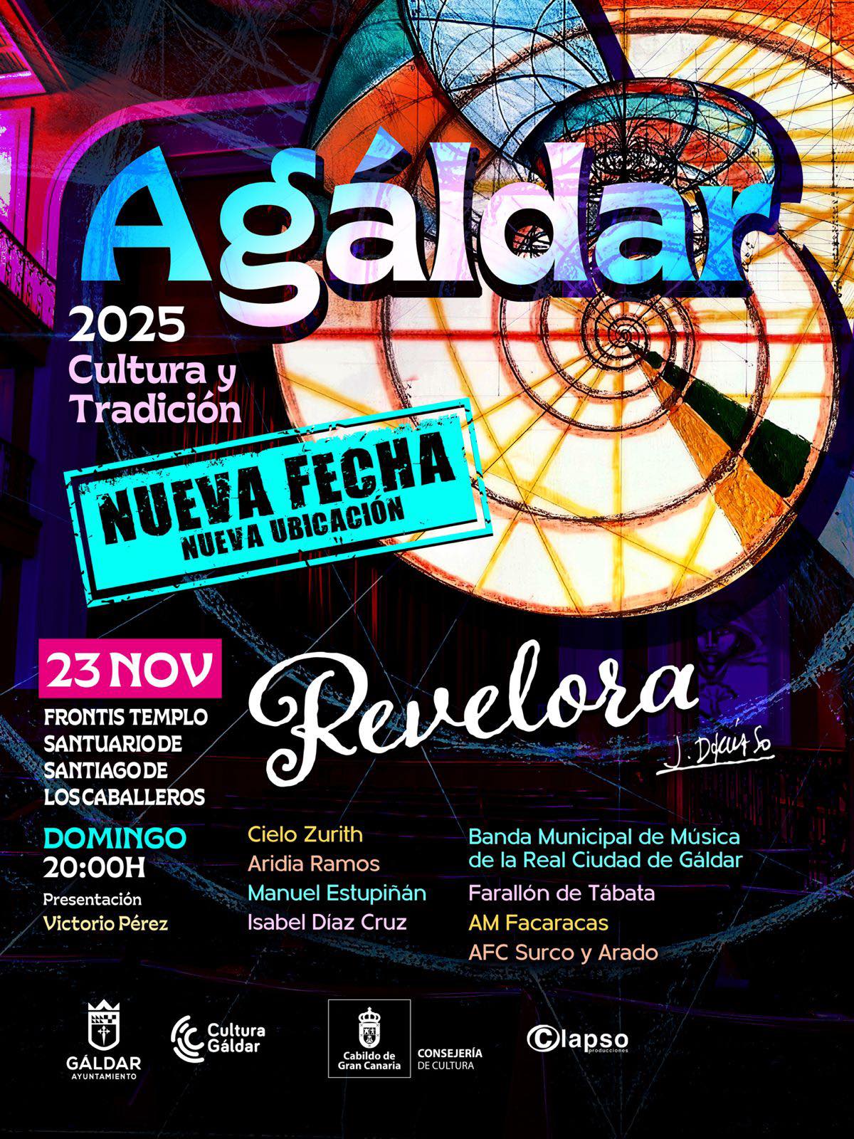 La 13ª edición de “Agáldar, cultura y tradición” ya tiene nueva fecha, será el próximo domingo 23 de noviembre a las 20.00 horas Después de que tuviera que ser pospuesto por causa de la lluvia. El espectáculo que reúne en un mismo escenario a la Banda Municipal de Música de la Real Ciudad de Gáldar junto a algunas de las agrupaciones musicales y de baile y solistas más destacados del municipio estrenará además ubicación, el frontis del Templo Santuario de Santiago de los Caballeros.