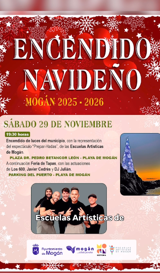 La Navidad llegará al municipio de Mogán el próximo sábado 29 de noviembre con el encendido de la iluminación navideña. El acto, que se celebrará en Playa de Mogán a partir de las 18:30 horas, dará la bienvenida a una de las épocas más entrañables del año con espectáculo de danza, Feria de Tapas y Los 600.