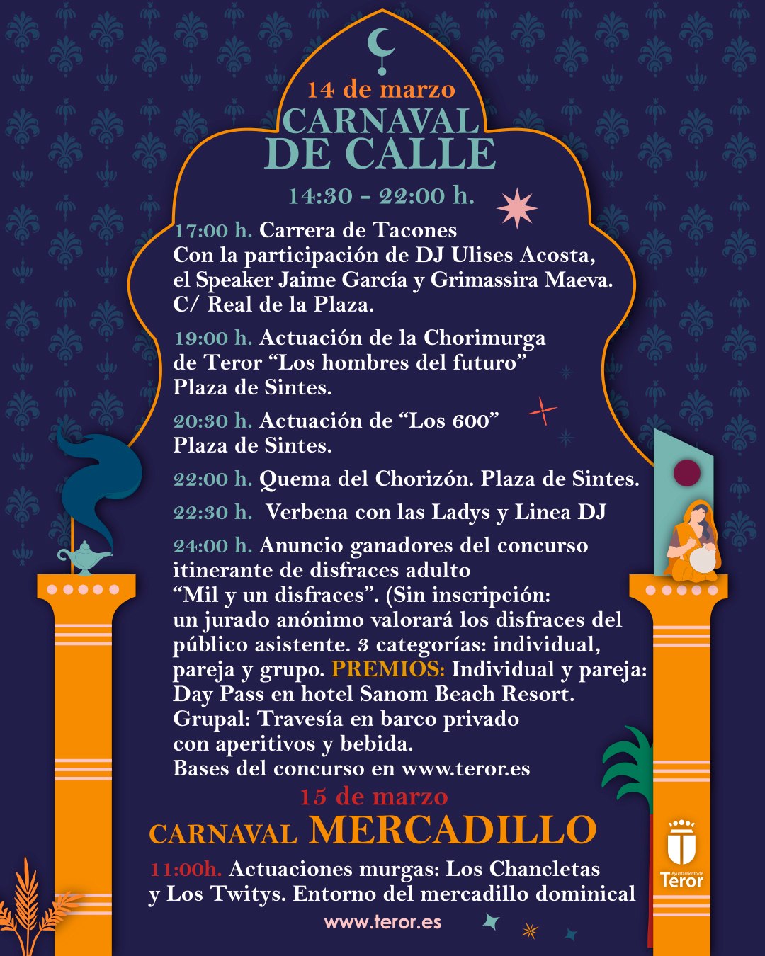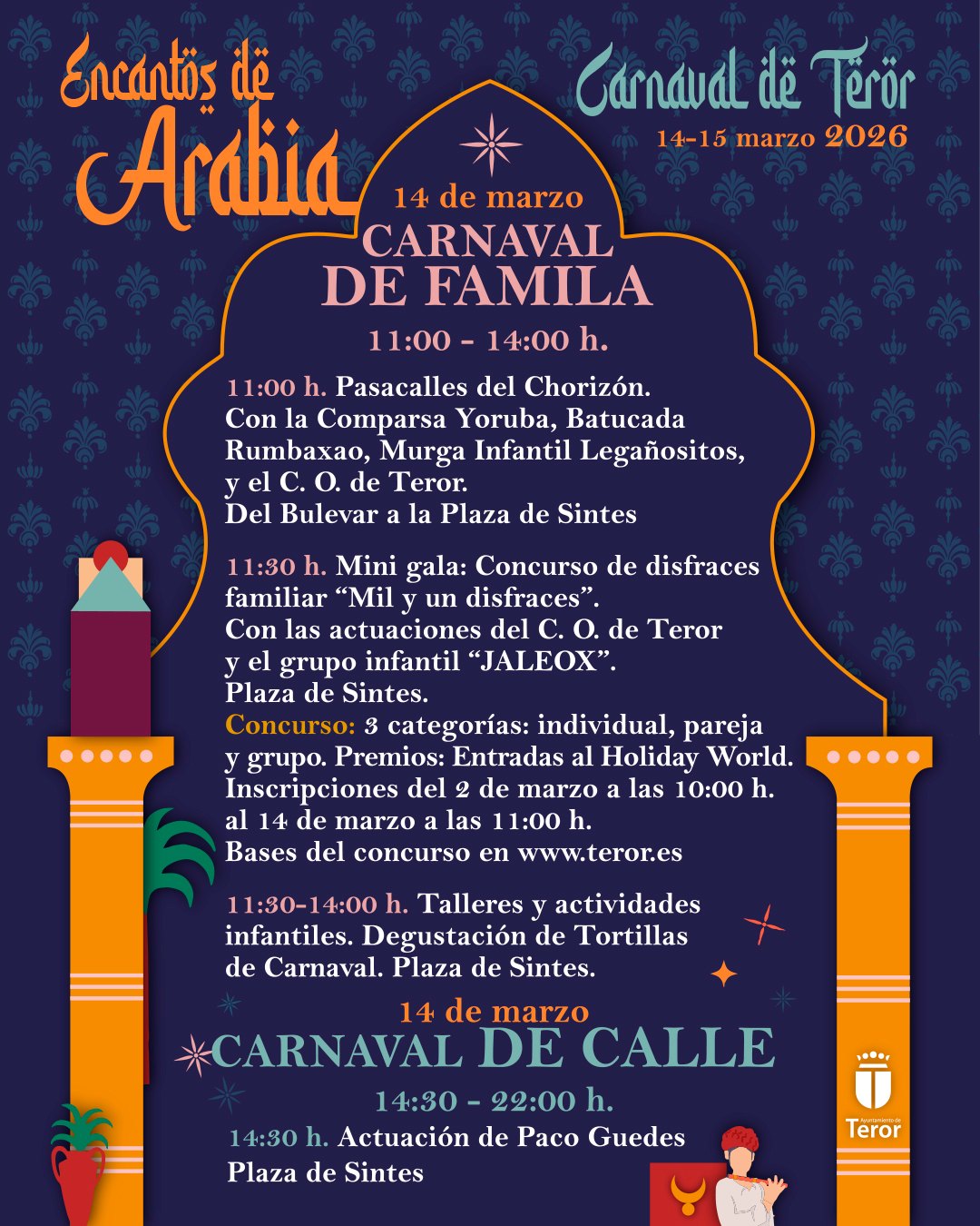 11:30 h. Mini gala: Concurso de disfraces familiar “Mil y un disfraces” (BASES e INSCRIPCIONES en www.teror.es). Con las actuaciones del Centro Ocupacional de Teror y el grupo infantil “JALEOX”. Escenario principal Plaza de Sintes.