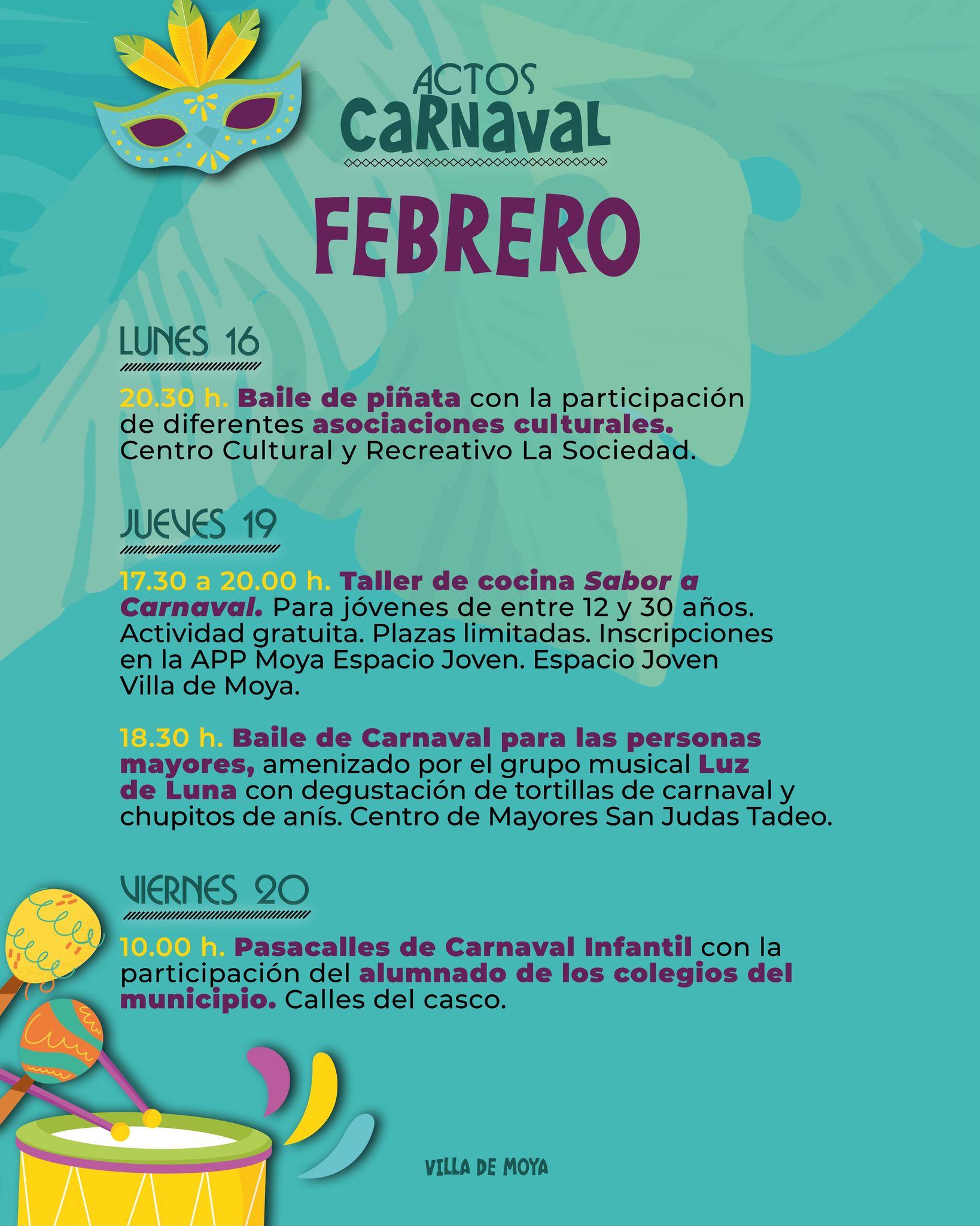 17.30 a 20.00 h. Taller de cocina Sabor a Carnaval. Para jóvenes de entre 12 y 30 años. Actividad gratuita. Plazas limitadas. Inscripciones en la APP Moya Espacio Joven. Espacio Joven Villa de Moya.