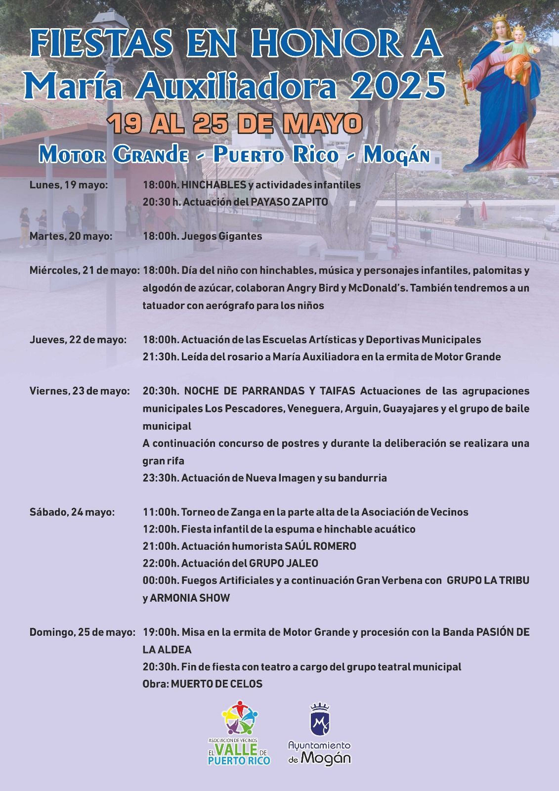 Las Fiestas en honor a María Auxiliadora concluirán el domingo 25 de mayo a las 19:00 horas con la misa y procesión con la banda Pasión de La Aldea. Seguidamente se celebrará el Fin de Fiestas de la mano del Área de Teatro de las Escuelas Artísticas de Mogán. mogan.es