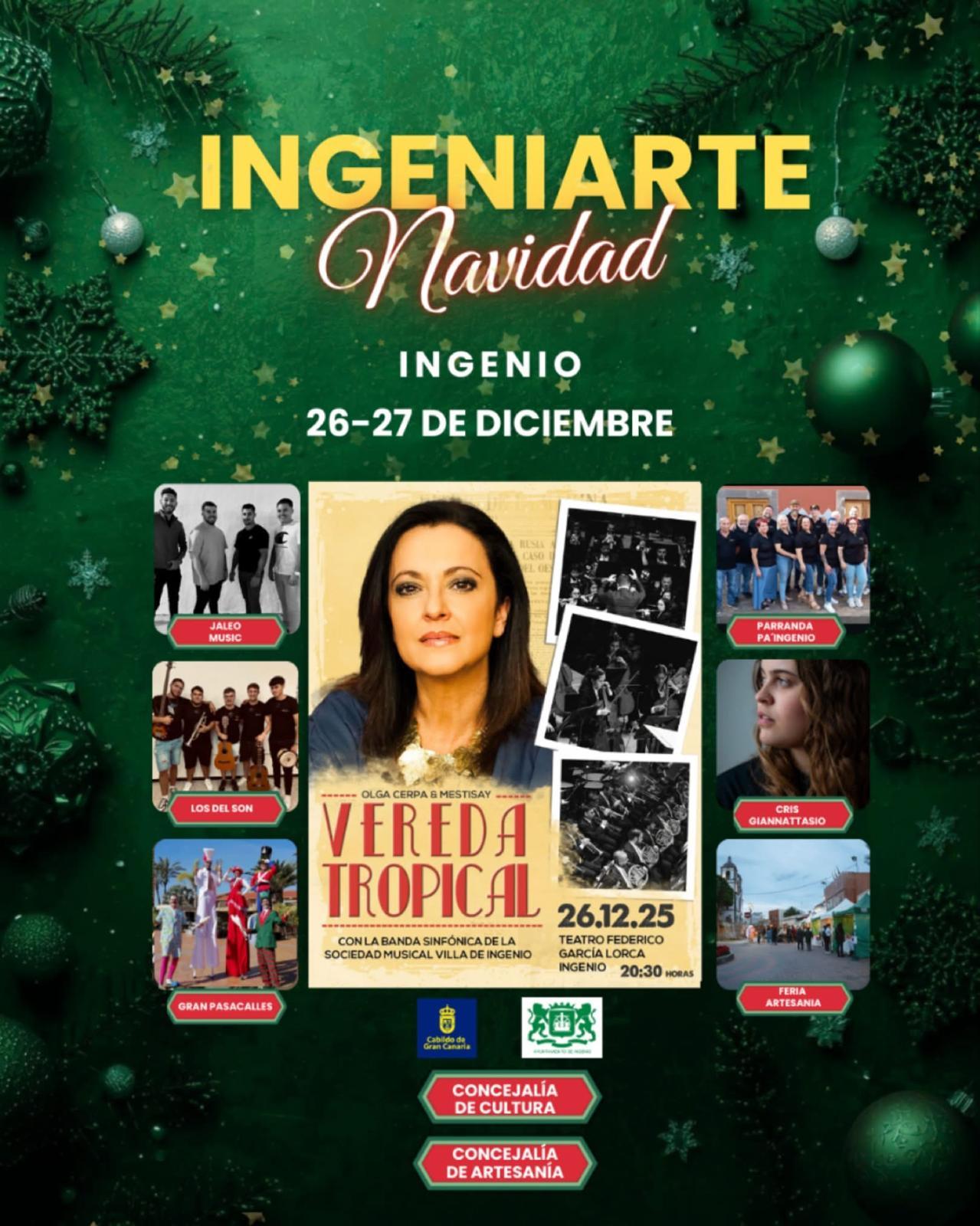 Tras la suspensión de su programación inicial debido a condiciones meteorológicas adversas, el festival ‘Ingeniarte en Navidad’ se celebrará los días viernes 26 y sábado 27 de diciembre, recuperando su propuesta cultural y artesanal para el disfrute de la ciudadanía. La iniciativa reunirá durante dos jornadas una amplia programación con distintos espacios del casco de Ingenio como escenario.