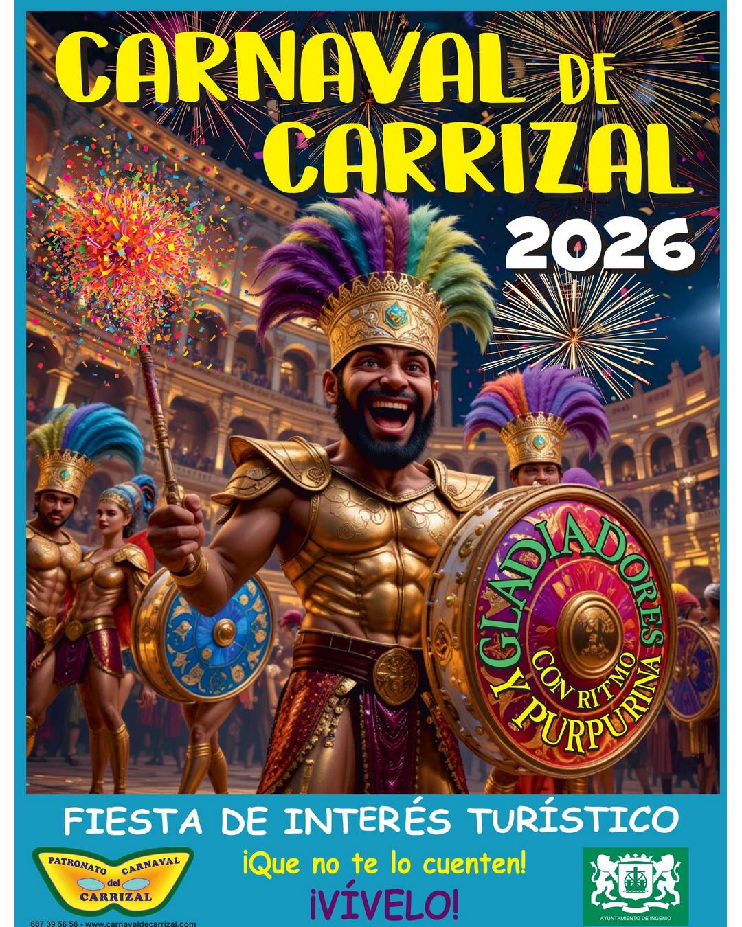 Organizado por el Patronato del Carnaval de Carrizal y el Ayuntamiento de Ingenio, el Carnaval llega bajo la alegoría de ‘Los Gladiadores’, trayendo este lunes, 6 de abril, el Carnaval Inclusivo, que se celebrará de 17:30 a 20:00 horas en la Plaza de La Coronación de La Jurada, contando con la participación de diversos centros ocupacionales de la isla. El martes, 7 de abril, será el turno de la Gala Drag, a partir de las 21:00 horas en el escenario de La Jurada, que contará con la obertura de la comparsa Aragüimé. Por otro lado, el miércoles 8 se celebrará el Concurso de Murgas a partir de las 20:30 horas, contando con la participación de Los Legañosos y Los Legañositos como murgas invitadas para abrir el certamen, mientras que el jueves 9 habrá actuaciones musicales y verbena con Las Ladys del Swing a partir de las 20:00 horas.