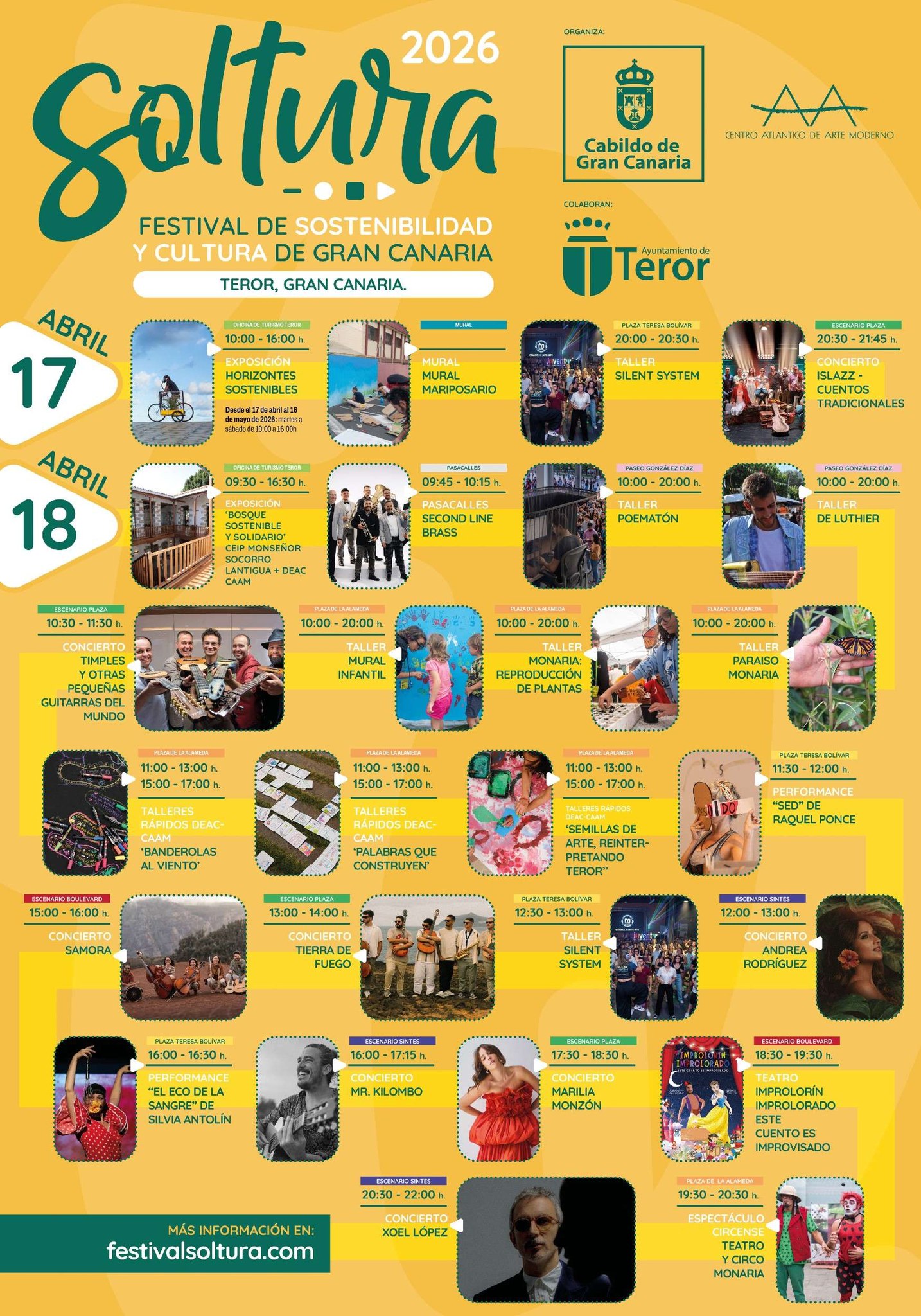 Teror será la sede de la sexta edición del Festival SOLTURA de Sostenibilidad y Cultura de Gran Canaria, que se celebrará los días 17 y 18 de abril de 2026, un acontecimiento cultural que celebra la música, el arte y la participación ciudadana con actividades para todos los públicos. -->> PROGRAMA <<--
